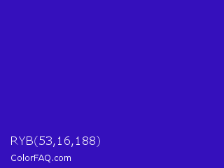 RYB 53,16,188 Color is a normal indigo color and the nearest color is Interdimensional Blue #360ccc. Hex code #3510bc and RGB value is rgb(53,16,188). In RGB color space, this color is composed of 21% red, 6% green, 74% blue, In CMYK color space, this color is composed of 72% cyan, 91% magenta, 0% yellow , 26% black , In HSL color space, this color has a hue angle of 253° , 84% saturation and 40% lightness.