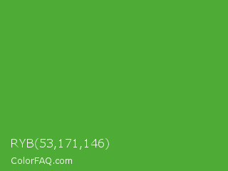 RYB 53,171,146 Color is a normal green color and the nearest color is Apple #4fa83d. Hex code #4eab35 and RGB value is rgb(78,171,53). In RGB color space, this color is composed of 31% red, 67% green, 21% blue, In CMYK color space, this color is composed of 54% cyan, 0% magenta, 69% yellow , 33% black , In HSL color space, this color has a hue angle of 107° , 53% saturation and 44% lightness.