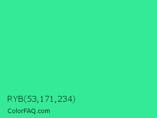 RYB 53,171,234 Color is a normal green color and the nearest color is Eucalyptus #44d7a8. Hex code #35ea96 and RGB value is rgb(53,234,150). In RGB color space, this color is composed of 21% red, 92% green, 59% blue, In CMYK color space, this color is composed of 77% cyan, 0% magenta, 36% yellow , 8% black , In HSL color space, this color has a hue angle of 152° , 81% saturation and 56% lightness.
