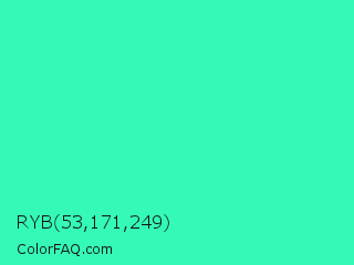 RYB 53,171,249 Color is a normal green color and the nearest color is Turquoise #40e0d0. Hex code #35f9b7 and RGB value is rgb(53,249,183). In RGB color space, this color is composed of 21% red, 98% green, 72% blue, In CMYK color space, this color is composed of 79% cyan, 0% magenta, 27% yellow , 2% black , In HSL color space, this color has a hue angle of 160° , 94% saturation and 59% lightness.