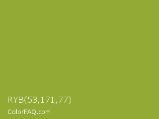 RYB 53,171,77 Color is a normal lime color and the nearest color is Sushi #87ab39. Hex code #93ab35 and RGB value is rgb(147,171,53). In RGB color space, this color is composed of 58% red, 67% green, 21% blue, In CMYK color space, this color is composed of 14% cyan, 0% magenta, 69% yellow , 33% black , In HSL color space, this color has a hue angle of 72° , 53% saturation and 44% lightness.