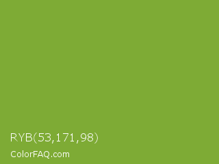 RYB 53,171,98 Color is a normal green color and the nearest color is Sushi #87ab39. Hex code #7eab35 and RGB value is rgb(126,171,53). In RGB color space, this color is composed of 49% red, 67% green, 21% blue, In CMYK color space, this color is composed of 26% cyan, 0% magenta, 69% yellow , 33% black , In HSL color space, this color has a hue angle of 83° , 53% saturation and 44% lightness.