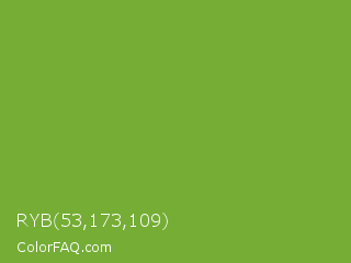 RYB 53,173,109 Color is a normal green color and the nearest color is Green RYB #66b032. Hex code #75ad35 and RGB value is rgb(117,173,53). In RGB color space, this color is composed of 46% red, 68% green, 21% blue, In CMYK color space, this color is composed of 32% cyan, 0% magenta, 69% yellow , 32% black , In HSL color space, this color has a hue angle of 88° , 53% saturation and 44% lightness.
