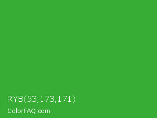 RYB 53,173,171 Color is a normal green color and the nearest color is Wageningen Green #34b233. Hex code #37ad35 and RGB value is rgb(55,173,53). In RGB color space, this color is composed of 22% red, 68% green, 21% blue, In CMYK color space, this color is composed of 68% cyan, 0% magenta, 69% yellow , 32% black , In HSL color space, this color has a hue angle of 119° , 53% saturation and 44% lightness.