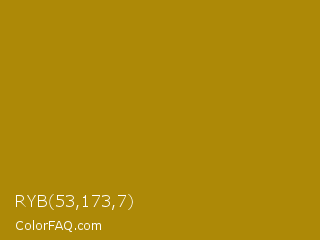 RYB 53,173,7 Color is a normal yellow color and the nearest color is Hot Toddy #b38007. Hex code #ad8907 and RGB value is rgb(173,137,7). In RGB color space, this color is composed of 68% red, 54% green, 3% blue, In CMYK color space, this color is composed of 0% cyan, 21% magenta, 96% yellow , 32% black , In HSL color space, this color has a hue angle of 47° , 92% saturation and 35% lightness.
