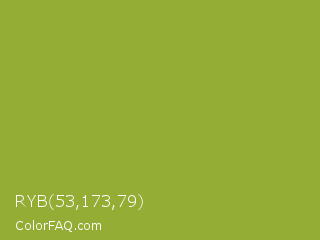 RYB 53,173,79 Color is a normal lime color and the nearest color is Sushi #87ab39. Hex code #93ad35 and RGB value is rgb(147,173,53). In RGB color space, this color is composed of 58% red, 68% green, 21% blue, In CMYK color space, this color is composed of 15% cyan, 0% magenta, 69% yellow , 32% black , In HSL color space, this color has a hue angle of 73° , 53% saturation and 44% lightness.