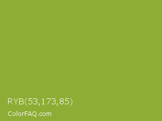 RYB 53,173,85 Color is a normal lime color and the nearest color is Sushi #87ab39. Hex code #8dad35 and RGB value is rgb(141,173,53). In RGB color space, this color is composed of 55% red, 68% green, 21% blue, In CMYK color space, this color is composed of 18% cyan, 0% magenta, 69% yellow , 32% black , In HSL color space, this color has a hue angle of 76° , 53% saturation and 44% lightness.