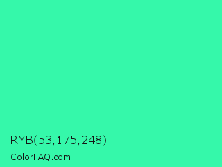 RYB 53,175,248 Color is a normal green color and the nearest color is Eucalyptus #44d7a8. Hex code #35f8aa and RGB value is rgb(53,248,170). In RGB color space, this color is composed of 21% red, 97% green, 67% blue, In CMYK color space, this color is composed of 79% cyan, 0% magenta, 31% yellow , 3% black , In HSL color space, this color has a hue angle of 156° , 93% saturation and 59% lightness.