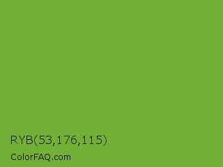 RYB 53,176,115 Color is a normal green color and the nearest color is Green RYB #66b032. Hex code #72b035 and RGB value is rgb(114,176,53). In RGB color space, this color is composed of 45% red, 69% green, 21% blue, In CMYK color space, this color is composed of 35% cyan, 0% magenta, 70% yellow , 31% black , In HSL color space, this color has a hue angle of 90° , 54% saturation and 45% lightness.