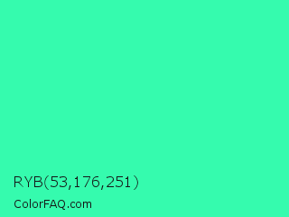RYB 53,176,251 Color is a normal green color and the nearest color is Eucalyptus #44d7a8. Hex code #35fbae and RGB value is rgb(53,251,174). In RGB color space, this color is composed of 21% red, 98% green, 68% blue, In CMYK color space, this color is composed of 79% cyan, 0% magenta, 31% yellow , 2% black , In HSL color space, this color has a hue angle of 157° , 96% saturation and 60% lightness.