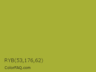 RYB 53,176,62 Color is a normal yellow color and the nearest color is Brass #b5a642. Hex code #a7b035 and RGB value is rgb(167,176,53). In RGB color space, this color is composed of 65% red, 69% green, 21% blue, In CMYK color space, this color is composed of 5% cyan, 0% magenta, 70% yellow , 31% black , In HSL color space, this color has a hue angle of 64° , 54% saturation and 45% lightness.