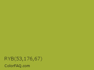 RYB 53,176,67 Color is a normal yellow color and the nearest color is Android Green #a4c639. Hex code #a2b035 and RGB value is rgb(162,176,53). In RGB color space, this color is composed of 64% red, 69% green, 21% blue, In CMYK color space, this color is composed of 8% cyan, 0% magenta, 70% yellow , 31% black , In HSL color space, this color has a hue angle of 67° , 54% saturation and 45% lightness.