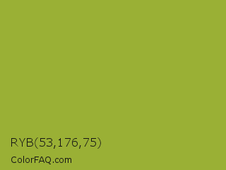 RYB 53,176,75 Color is a normal lime color and the nearest color is Sushi #87ab39. Hex code #9ab035 and RGB value is rgb(154,176,53). In RGB color space, this color is composed of 60% red, 69% green, 21% blue, In CMYK color space, this color is composed of 13% cyan, 0% magenta, 70% yellow , 31% black , In HSL color space, this color has a hue angle of 71° , 54% saturation and 45% lightness.