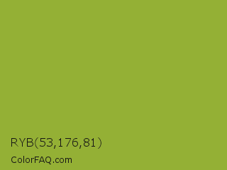 RYB 53,176,81 Color is a normal lime color and the nearest color is Sushi #87ab39. Hex code #94b035 and RGB value is rgb(148,176,53). In RGB color space, this color is composed of 58% red, 69% green, 21% blue, In CMYK color space, this color is composed of 16% cyan, 0% magenta, 70% yellow , 31% black , In HSL color space, this color has a hue angle of 74° , 54% saturation and 45% lightness.