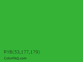 RYB 53,177,179 Color is a normal green color and the nearest color is Wageningen Green #34b233. Hex code #35b337 and RGB value is rgb(53,179,55). In RGB color space, this color is composed of 21% red, 70% green, 22% blue, In CMYK color space, this color is composed of 70% cyan, 0% magenta, 69% yellow , 30% black , In HSL color space, this color has a hue angle of 121° , 54% saturation and 45% lightness.