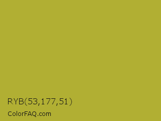 RYB 53,177,51 Color is a normal yellow color and the nearest color is Brass #b5a642. Hex code #b1af33 and RGB value is rgb(177,175,51). In RGB color space, this color is composed of 69% red, 69% green, 20% blue, In CMYK color space, this color is composed of 0% cyan, 1% magenta, 71% yellow , 31% black , In HSL color space, this color has a hue angle of 59° , 55% saturation and 45% lightness.