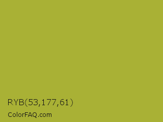 RYB 53,177,61 Color is a normal yellow color and the nearest color is Brass #b5a642. Hex code #a9b135 and RGB value is rgb(169,177,53). In RGB color space, this color is composed of 66% red, 69% green, 21% blue, In CMYK color space, this color is composed of 5% cyan, 0% magenta, 70% yellow , 31% black , In HSL color space, this color has a hue angle of 64° , 54% saturation and 45% lightness.