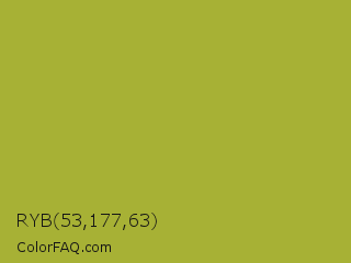 RYB 53,177,63 Color is a normal yellow color and the nearest color is Android Green #a4c639. Hex code #a7b135 and RGB value is rgb(167,177,53). In RGB color space, this color is composed of 65% red, 69% green, 21% blue, In CMYK color space, this color is composed of 6% cyan, 0% magenta, 70% yellow , 31% black , In HSL color space, this color has a hue angle of 65° , 54% saturation and 45% lightness.