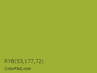 RYB 53,177,72 Color is a normal yellow color and the nearest color is Android Green #a4c639. Hex code #9eb135 and RGB value is rgb(158,177,53). In RGB color space, this color is composed of 62% red, 69% green, 21% blue, In CMYK color space, this color is composed of 11% cyan, 0% magenta, 70% yellow , 31% black , In HSL color space, this color has a hue angle of 69° , 54% saturation and 45% lightness.