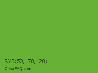 RYB 53,178,128 Color is a normal green color and the nearest color is Green RYB #66b032. Hex code #67b235 and RGB value is rgb(103,178,53). In RGB color space, this color is composed of 40% red, 70% green, 21% blue, In CMYK color space, this color is composed of 42% cyan, 0% magenta, 70% yellow , 30% black , In HSL color space, this color has a hue angle of 96° , 54% saturation and 45% lightness.