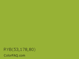 RYB 53,178,80 Color is a normal lime color and the nearest color is Sushi #87ab39. Hex code #97b235 and RGB value is rgb(151,178,53). In RGB color space, this color is composed of 59% red, 70% green, 21% blue, In CMYK color space, this color is composed of 15% cyan, 0% magenta, 70% yellow , 30% black , In HSL color space, this color has a hue angle of 73° , 54% saturation and 45% lightness.