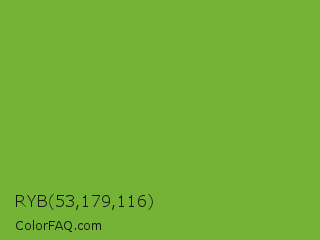 RYB 53,179,116 Color is a normal green color and the nearest color is Green RYB #66b032. Hex code #74b335 and RGB value is rgb(116,179,53). In RGB color space, this color is composed of 45% red, 70% green, 21% blue, In CMYK color space, this color is composed of 35% cyan, 0% magenta, 70% yellow , 30% black , In HSL color space, this color has a hue angle of 90° , 54% saturation and 45% lightness.