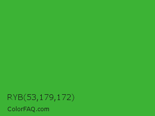 RYB 53,179,172 Color is a normal green color and the nearest color is Wageningen Green #34b233. Hex code #3cb335 and RGB value is rgb(60,179,53). In RGB color space, this color is composed of 24% red, 70% green, 21% blue, In CMYK color space, this color is composed of 66% cyan, 0% magenta, 70% yellow , 30% black , In HSL color space, this color has a hue angle of 117° , 54% saturation and 45% lightness.