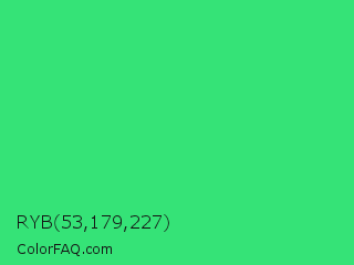 RYB 53,179,227 Color is a normal green color and the nearest color is UFO Green #3cd070. Hex code #35e377 and RGB value is rgb(53,227,119). In RGB color space, this color is composed of 21% red, 89% green, 47% blue, In CMYK color space, this color is composed of 77% cyan, 0% magenta, 48% yellow , 11% black , In HSL color space, this color has a hue angle of 143° , 76% saturation and 55% lightness.