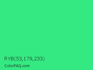 RYB 53,179,233 Color is a normal green color and the nearest color is UFO Green #3cd070. Hex code #35e982 and RGB value is rgb(53,233,130). In RGB color space, this color is composed of 21% red, 91% green, 51% blue, In CMYK color space, this color is composed of 77% cyan, 0% magenta, 44% yellow , 9% black , In HSL color space, this color has a hue angle of 146° , 80% saturation and 56% lightness.