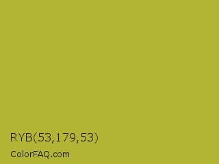 RYB 53,179,53 Color is a normal yellow color and the nearest color is Brass #b5a642. Hex code #b3b335 and RGB value is rgb(179,179,53). In RGB color space, this color is composed of 70% red, 70% green, 21% blue, In CMYK color space, this color is composed of 0% cyan, 0% magenta, 70% yellow , 30% black , In HSL color space, this color has a hue angle of 60° , 54% saturation and 45% lightness.