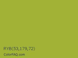 RYB 53,179,72 Color is a normal yellow color and the nearest color is Android Green #a4c639. Hex code #a0b335 and RGB value is rgb(160,179,53). In RGB color space, this color is composed of 63% red, 70% green, 21% blue, In CMYK color space, this color is composed of 11% cyan, 0% magenta, 70% yellow , 30% black , In HSL color space, this color has a hue angle of 69° , 54% saturation and 45% lightness.