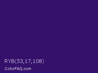 RYB 53,17,108 Color is a dark violet color and the nearest color is Christalle #33036b. Hex code #35116c and RGB value is rgb(53,17,108). In RGB color space, this color is composed of 21% red, 7% green, 42% blue, In CMYK color space, this color is composed of 51% cyan, 84% magenta, 0% yellow , 58% black , In HSL color space, this color has a hue angle of 264° , 73% saturation and 25% lightness.
