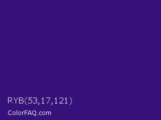 RYB 53,17,121 Color is a dark violet color and the nearest color is Persian Indigo #32127a. Hex code #351179 and RGB value is rgb(53,17,121). In RGB color space, this color is composed of 21% red, 7% green, 47% blue, In CMYK color space, this color is composed of 56% cyan, 86% magenta, 0% yellow , 53% black , In HSL color space, this color has a hue angle of 261° , 75% saturation and 27% lightness.