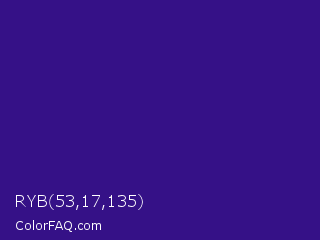 RYB 53,17,135 Color is a dark indigo color and the nearest color is Pixie Powder #391285. Hex code #351187 and RGB value is rgb(53,17,135). In RGB color space, this color is composed of 21% red, 7% green, 53% blue, In CMYK color space, this color is composed of 61% cyan, 87% magenta, 0% yellow , 47% black , In HSL color space, this color has a hue angle of 258° , 78% saturation and 30% lightness.