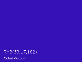 RYB 53,17,182 Color is a normal indigo color and the nearest color is Interdimensional Blue #360ccc. Hex code #3511b6 and RGB value is rgb(53,17,182). In RGB color space, this color is composed of 21% red, 7% green, 71% blue, In CMYK color space, this color is composed of 71% cyan, 91% magenta, 0% yellow , 29% black , In HSL color space, this color has a hue angle of 253° , 83% saturation and 39% lightness.