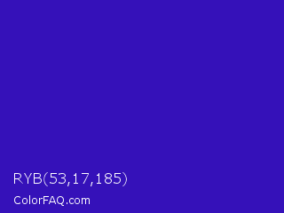 RYB 53,17,185 Color is a normal indigo color and the nearest color is Interdimensional Blue #360ccc. Hex code #3511b9 and RGB value is rgb(53,17,185). In RGB color space, this color is composed of 21% red, 7% green, 73% blue, In CMYK color space, this color is composed of 71% cyan, 91% magenta, 0% yellow , 27% black , In HSL color space, this color has a hue angle of 253° , 83% saturation and 40% lightness.