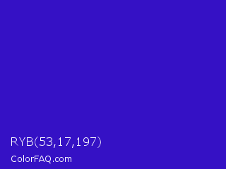 RYB 53,17,197 Color is a normal indigo color and the nearest color is Interdimensional Blue #360ccc. Hex code #3511c5 and RGB value is rgb(53,17,197). In RGB color space, this color is composed of 21% red, 7% green, 77% blue, In CMYK color space, this color is composed of 73% cyan, 91% magenta, 0% yellow , 23% black , In HSL color space, this color has a hue angle of 252° , 84% saturation and 42% lightness.
