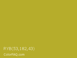 RYB 53,182,43 Color is a normal yellow color and the nearest color is Hokey Pokey #c8a528. Hex code #b6ad2b and RGB value is rgb(182,173,43). In RGB color space, this color is composed of 71% red, 68% green, 17% blue, In CMYK color space, this color is composed of 0% cyan, 5% magenta, 76% yellow , 29% black , In HSL color space, this color has a hue angle of 56° , 62% saturation and 44% lightness.