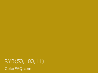 RYB 53,183,11 Color is a normal yellow color and the nearest color is Dark Goldenrod #b8860b. Hex code #b7950b and RGB value is rgb(183,149,11). In RGB color space, this color is composed of 72% red, 58% green, 4% blue, In CMYK color space, this color is composed of 0% cyan, 19% magenta, 94% yellow , 28% black , In HSL color space, this color has a hue angle of 48° , 89% saturation and 38% lightness.