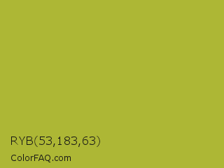 RYB 53,183,63 Color is a normal yellow color and the nearest color is Android Green #a4c639. Hex code #adb735 and RGB value is rgb(173,183,53). In RGB color space, this color is composed of 68% red, 72% green, 21% blue, In CMYK color space, this color is composed of 5% cyan, 0% magenta, 71% yellow , 28% black , In HSL color space, this color has a hue angle of 65° , 55% saturation and 46% lightness.