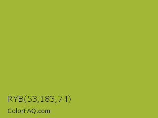 RYB 53,183,74 Color is a normal yellow color and the nearest color is Android Green #a4c639. Hex code #a2b735 and RGB value is rgb(162,183,53). In RGB color space, this color is composed of 64% red, 72% green, 21% blue, In CMYK color space, this color is composed of 11% cyan, 0% magenta, 71% yellow , 28% black , In HSL color space, this color has a hue angle of 70° , 55% saturation and 46% lightness.
