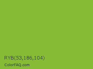 RYB 53,186,104 Color is a normal green color and the nearest color is Sushi #87ab39. Hex code #87ba35 and RGB value is rgb(135,186,53). In RGB color space, this color is composed of 53% red, 73% green, 21% blue, In CMYK color space, this color is composed of 27% cyan, 0% magenta, 72% yellow , 27% black , In HSL color space, this color has a hue angle of 83° , 56% saturation and 47% lightness.