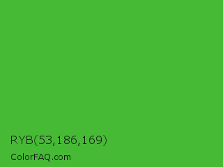 RYB 53,186,169 Color is a normal green color and the nearest color is Wageningen Green #34b233. Hex code #46ba35 and RGB value is rgb(70,186,53). In RGB color space, this color is composed of 27% red, 73% green, 21% blue, In CMYK color space, this color is composed of 62% cyan, 0% magenta, 72% yellow , 27% black , In HSL color space, this color has a hue angle of 112° , 56% saturation and 47% lightness.