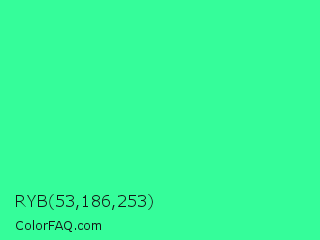 RYB 53,186,253 Color is a normal green color and the nearest color is Eucalyptus #44d7a8. Hex code #35fd9a and RGB value is rgb(53,253,154). In RGB color space, this color is composed of 21% red, 99% green, 60% blue, In CMYK color space, this color is composed of 79% cyan, 0% magenta, 39% yellow , 1% black , In HSL color space, this color has a hue angle of 150° , 98% saturation and 60% lightness.