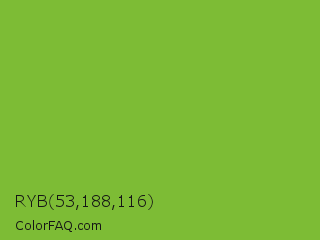 RYB 53,188,116 Color is a normal green color and the nearest color is Sushi #87ab39. Hex code #7dbc35 and RGB value is rgb(125,188,53). In RGB color space, this color is composed of 49% red, 74% green, 21% blue, In CMYK color space, this color is composed of 34% cyan, 0% magenta, 72% yellow , 26% black , In HSL color space, this color has a hue angle of 88° , 56% saturation and 47% lightness.