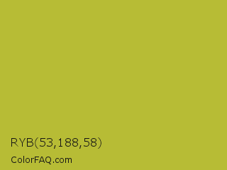 RYB 53,188,58 Color is a normal yellow color and the nearest color is Earls Green #c9b93b. Hex code #b7bc35 and RGB value is rgb(183,188,53). In RGB color space, this color is composed of 72% red, 74% green, 21% blue, In CMYK color space, this color is composed of 3% cyan, 0% magenta, 72% yellow , 26% black , In HSL color space, this color has a hue angle of 62° , 56% saturation and 47% lightness.