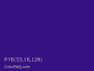 RYB 53,18,128 Color is a dark indigo color and the nearest color is Pixie Powder #391285. Hex code #351280 and RGB value is rgb(53,18,128). In RGB color space, this color is composed of 21% red, 7% green, 50% blue, In CMYK color space, this color is composed of 59% cyan, 86% magenta, 0% yellow , 50% black , In HSL color space, this color has a hue angle of 259° , 75% saturation and 29% lightness.