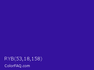 RYB 53,18,158 Color is a normal indigo color and the nearest color is Blue Gem #2c0e8c. Hex code #35129e and RGB value is rgb(53,18,158). In RGB color space, this color is composed of 21% red, 7% green, 62% blue, In CMYK color space, this color is composed of 66% cyan, 89% magenta, 0% yellow , 38% black , In HSL color space, this color has a hue angle of 255° , 80% saturation and 35% lightness.