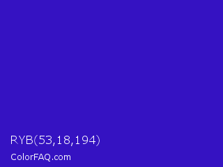 RYB 53,18,194 Color is a normal indigo color and the nearest color is Interdimensional Blue #360ccc. Hex code #3512c2 and RGB value is rgb(53,18,194). In RGB color space, this color is composed of 21% red, 7% green, 76% blue, In CMYK color space, this color is composed of 73% cyan, 91% magenta, 0% yellow , 24% black , In HSL color space, this color has a hue angle of 252° , 83% saturation and 42% lightness.