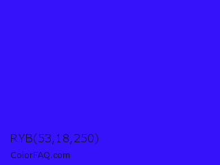RYB 53,18,250 Color is a normal indigo color and the nearest color is Electric Ultramarine #3f00ff. Hex code #3512fa and RGB value is rgb(53,18,250). In RGB color space, this color is composed of 21% red, 7% green, 98% blue, In CMYK color space, this color is composed of 79% cyan, 93% magenta, 0% yellow , 2% black , In HSL color space, this color has a hue angle of 249° , 96% saturation and 53% lightness.